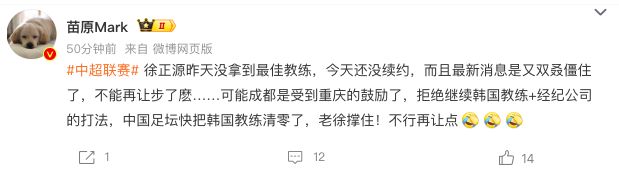 苗原还哀叹道:“中国足坛快把韩国教练清零了”。除了张外龙之外,此前,泰山主帅崔康熙也已经离任。如果徐正源也未能与蓉城续约,中超新赛季可能再也没有韩国教练的身影。